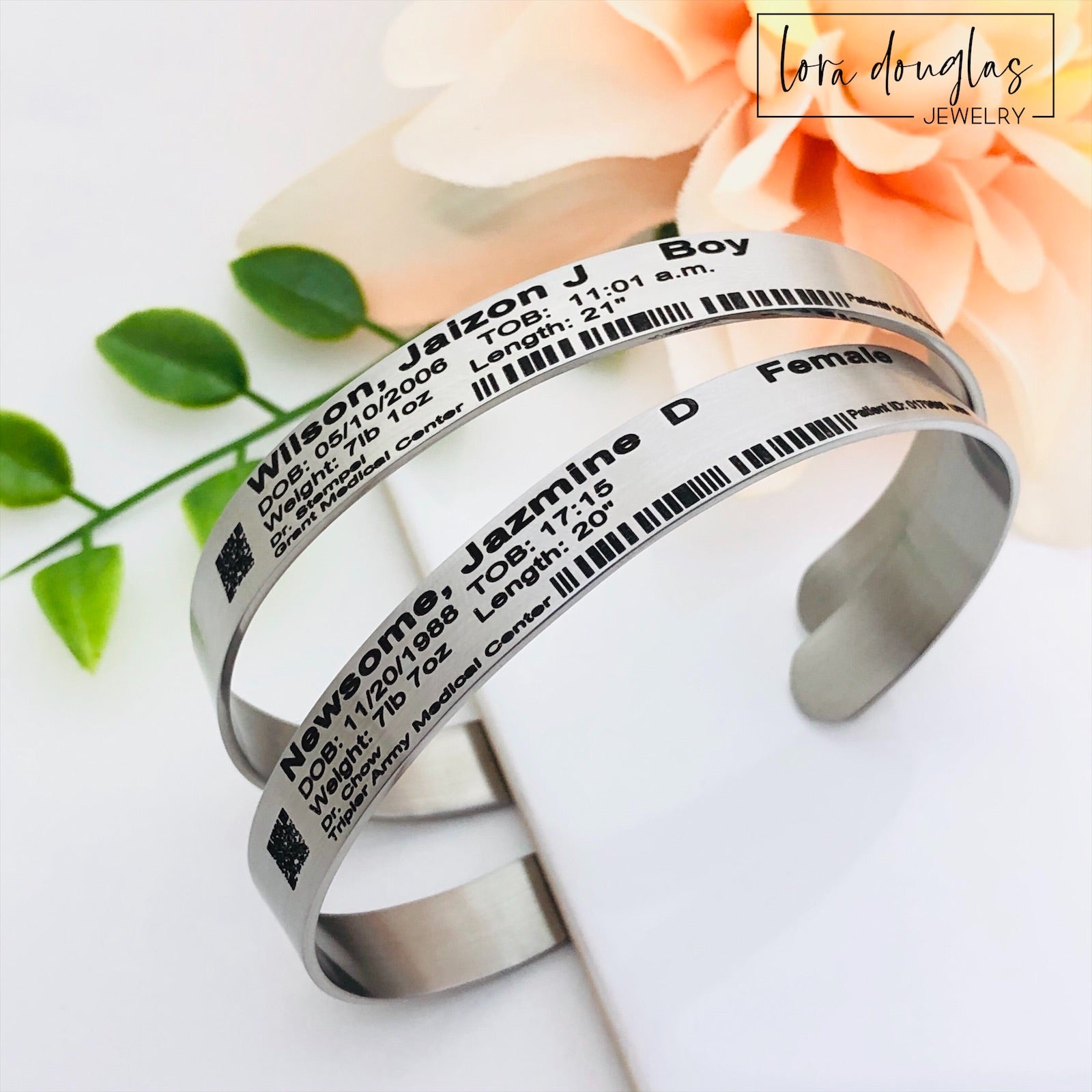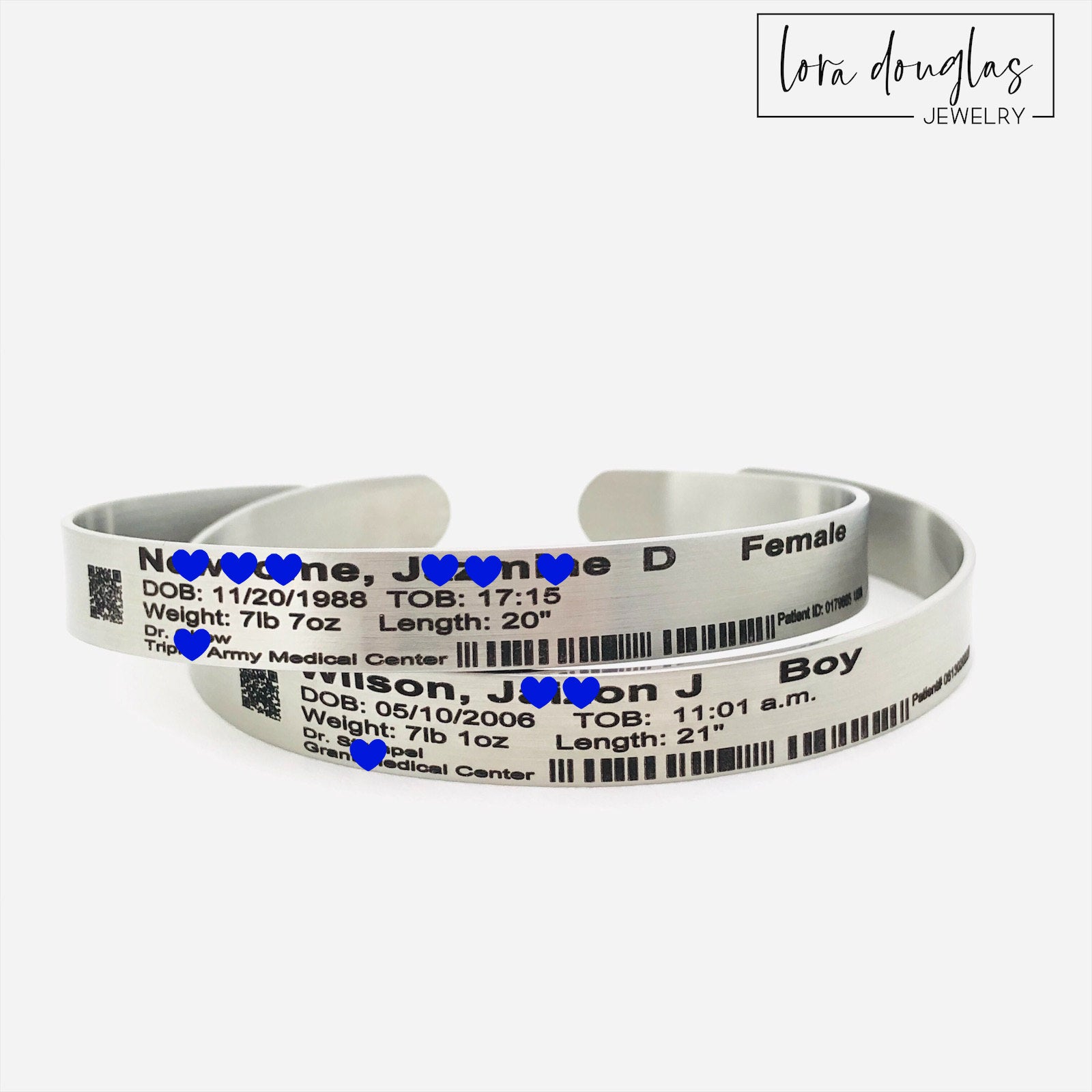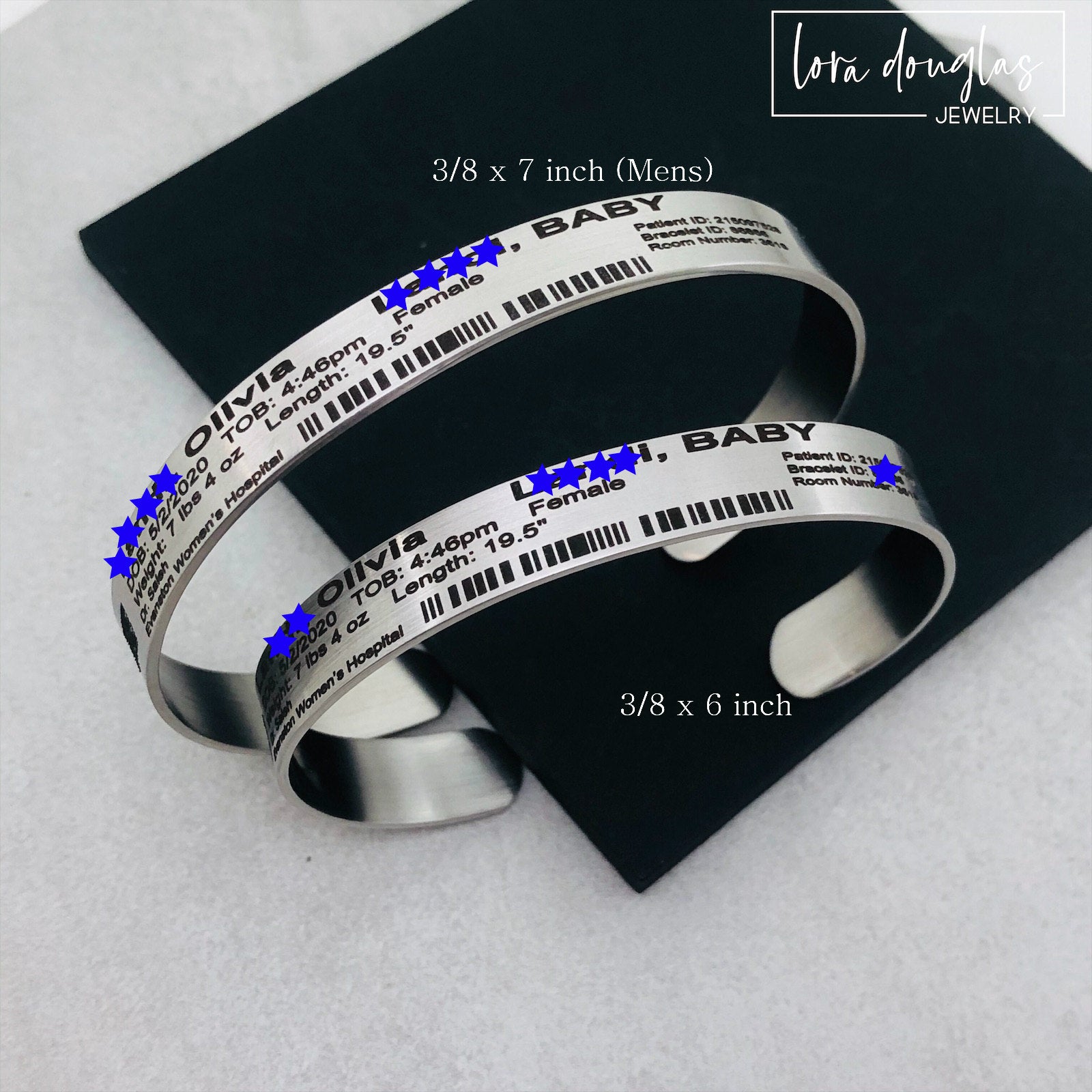 Create a meaningful keepsake with this personalized hospital ID bracelet, designed to replicate the look of authentic hospital bracelets. Expertly engraved with your details, it makes a thoughtful gift for new parents celebrating a baby's arrival or a heartfelt Father's Day present. Durable and comfortable, this bracelet combines sentimental value with a classic medical style.