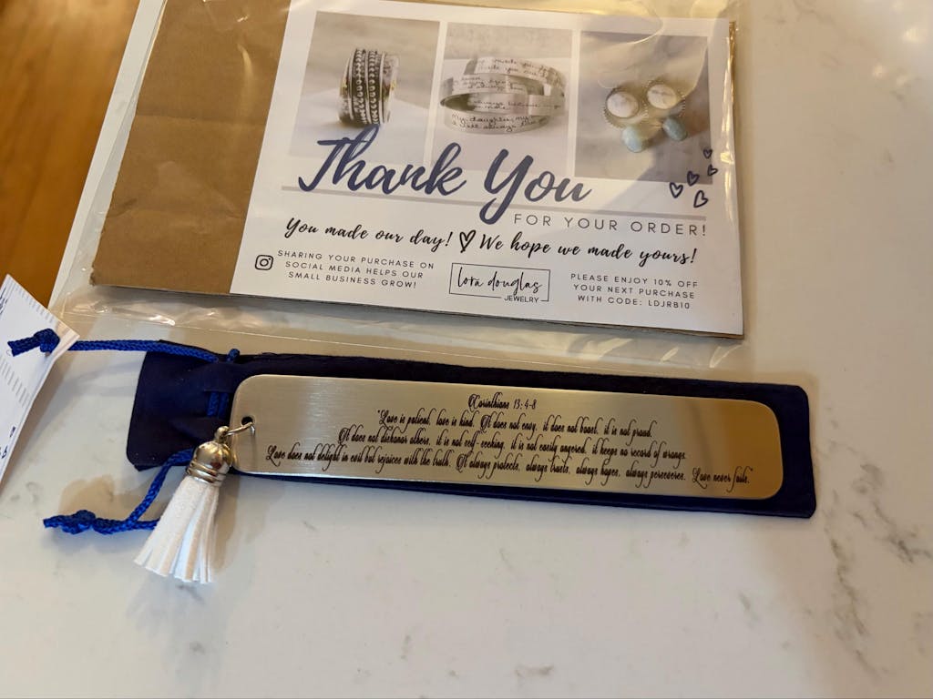Add a splash of inspiration to your reading with this playful personalized metal bookmark! Custom engraved with your favorite Bible verse, it’s the perfect way to mark your spot with a touch of faith and fun. Durable and stylish, this bookmark keeps your scripture handy while brightening your day one page at a time.