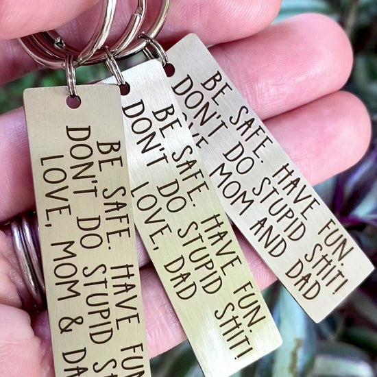 Personalized and fun, this metal keychain reads "Be Safe. Have Fun. Don't Do Stupid Shit!" and can be customized with any name. The perfect gift for your cheeky teenager who needs a reminder to stay out of trouble. Don't do it, kiddo!